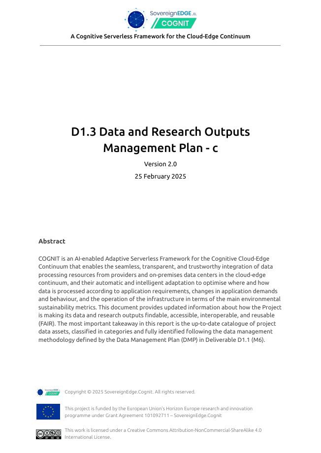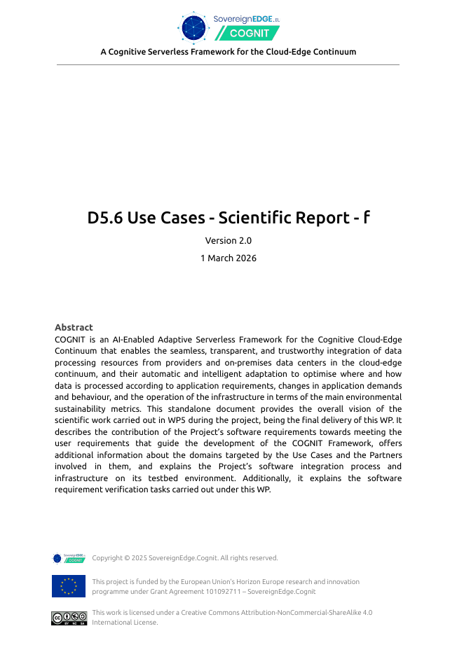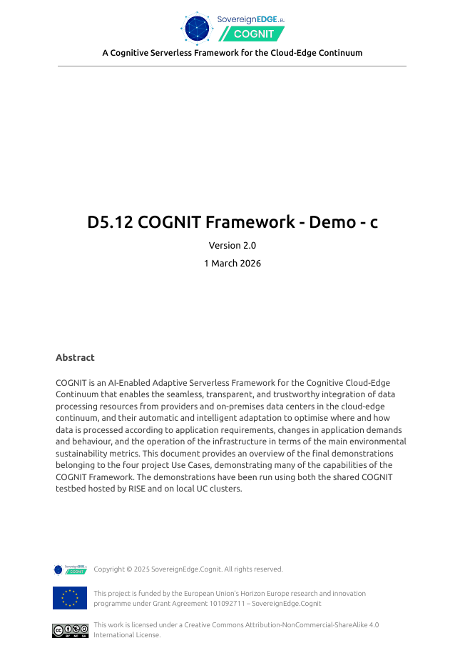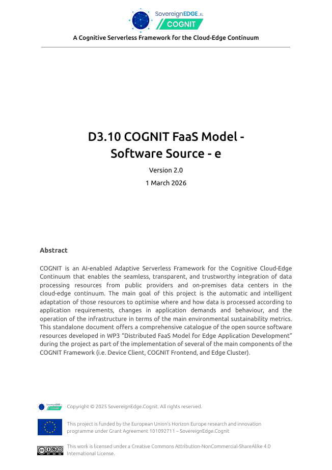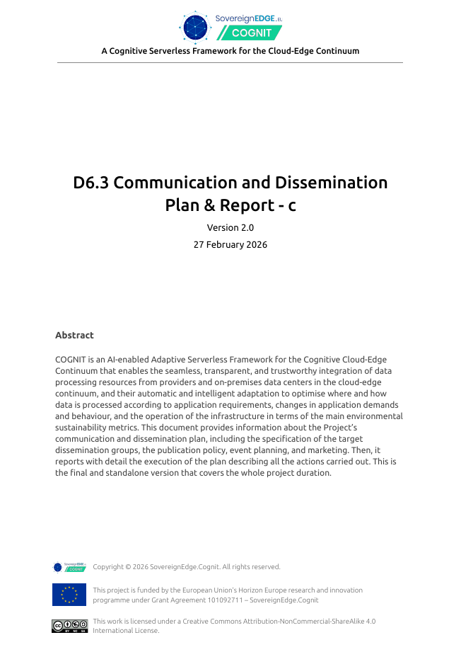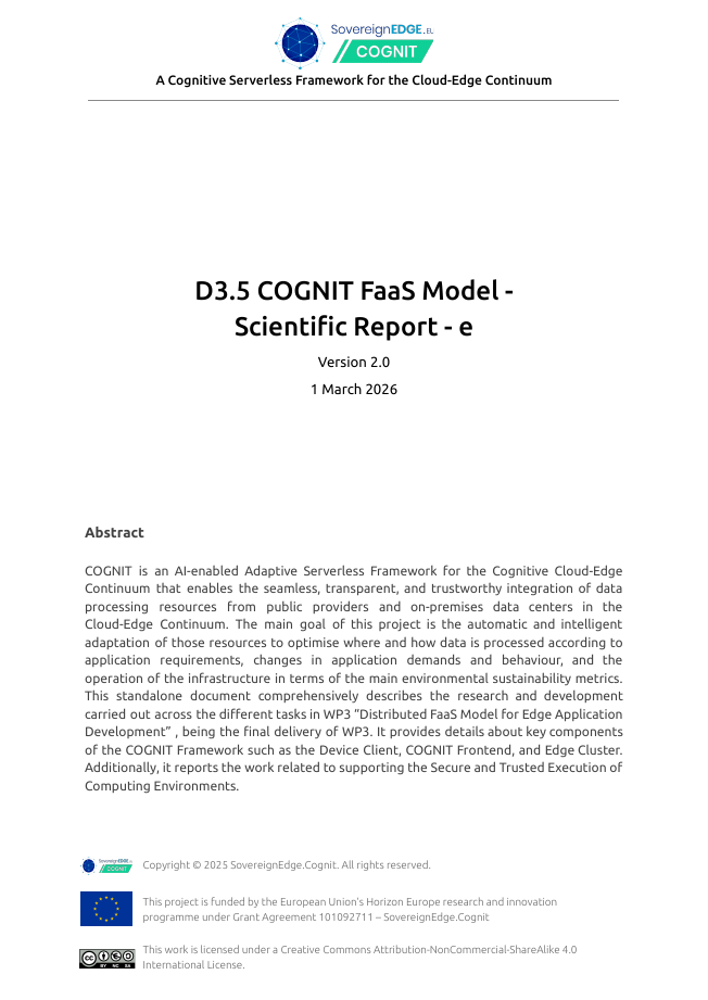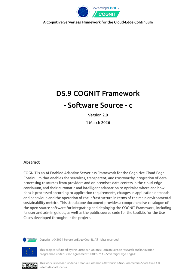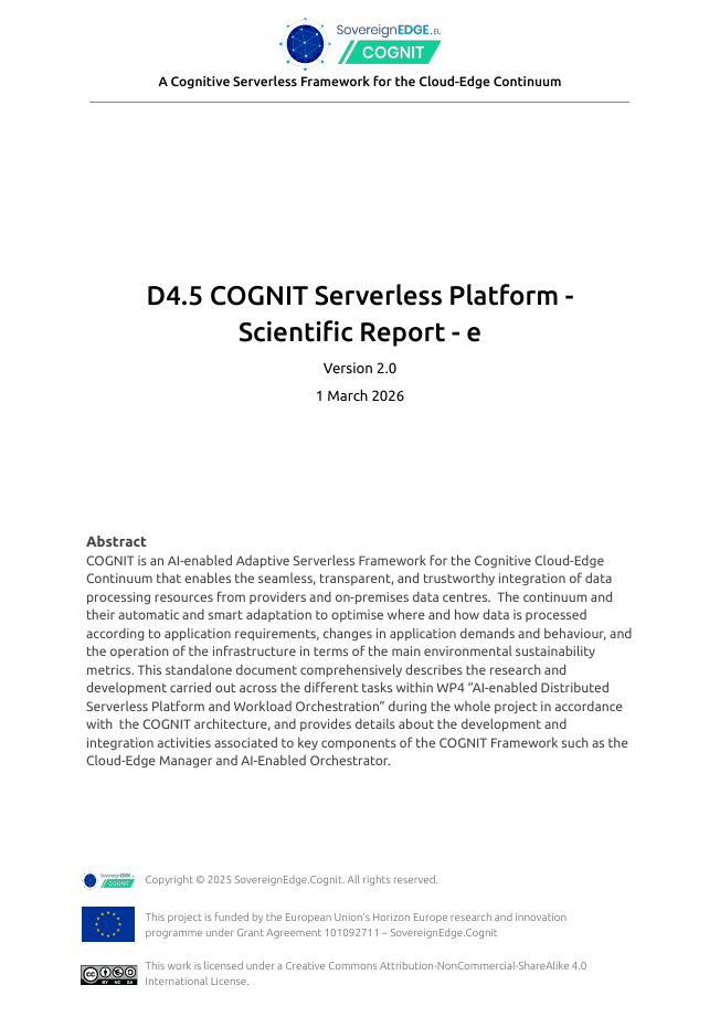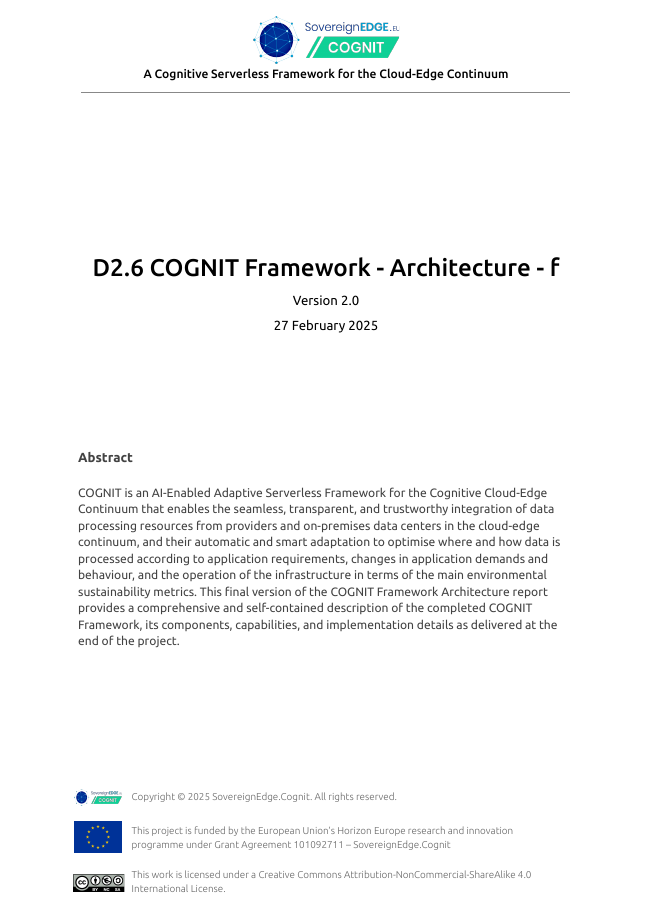 Project Deliverables Get access to all the public reports produced by the COGNIT Project WP1 – Project Management WP2 – Adaptive Cloud-Edge Serverless Framework Architecture WP3 – Distributed FaaS Model for Edge Application Development WP4 – AI-enabled Distributed Serverless Platform and Workload Orchestration WP5 – Adaptive Serverless Framework Integration and Validation WP6 – Dissemination, Communication, Exploitation, and Standardization